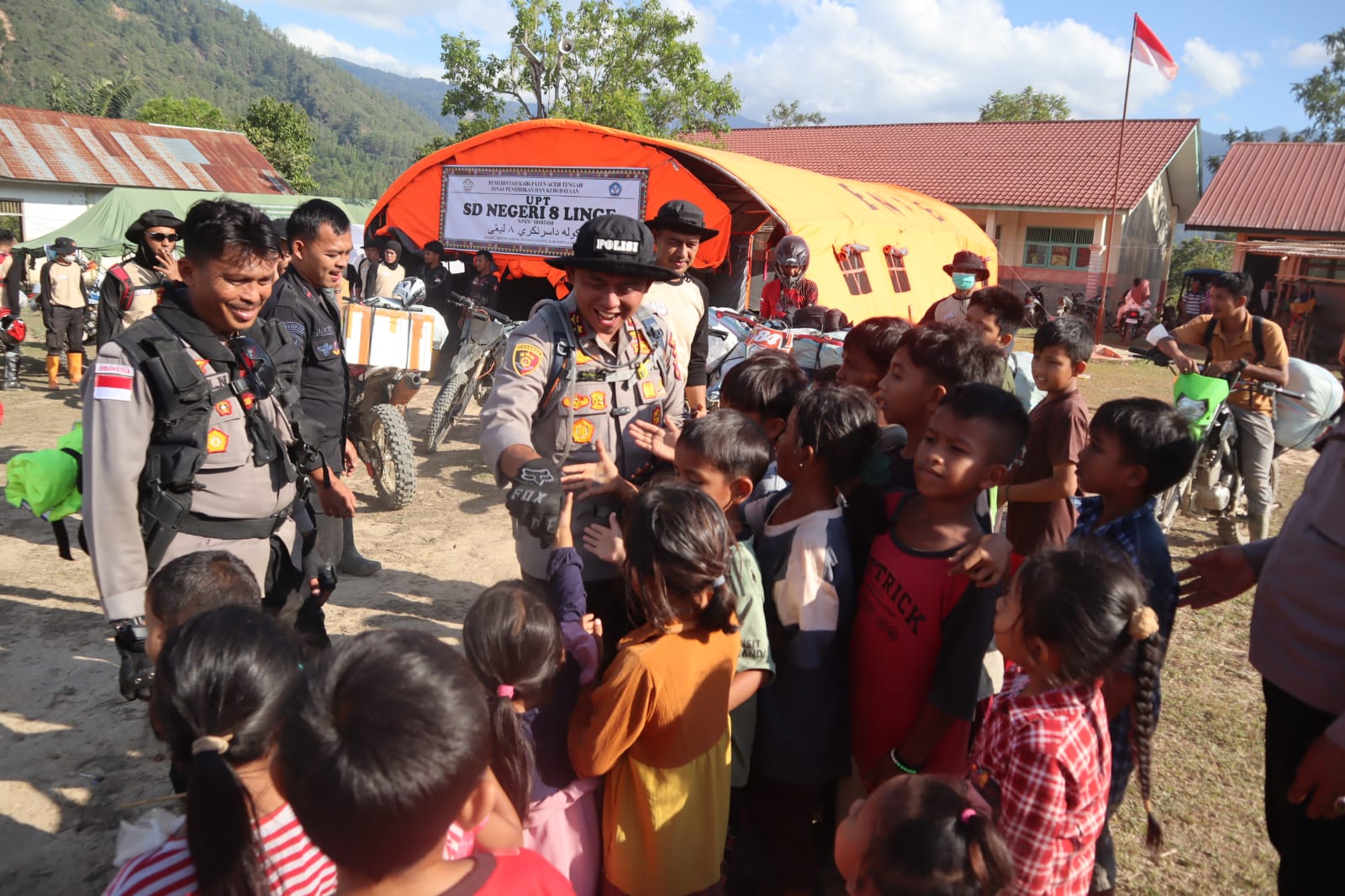 Kehadiran Kapolres beserta rombongan disambut hangat oleh warga, khususnya anak-anak. Kapolres menyempatkan diri bercengkerama dengan masyarakat, memberikan semangat, serta menghadirkan keceriaan di tengah suasana duka pascabencana.