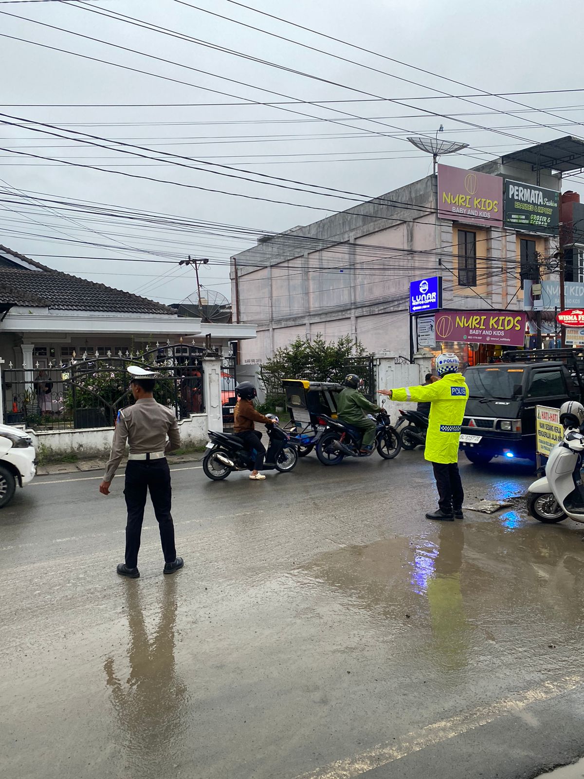 Selain pengaturan arus, personel juga aktif memberikan imbauan tertib berlalu lintas kepada pengendara roda dua maupun roda empat. Masyarakat diminta berhati-hati, tidak memacu kendaraan di jalanan licin, serta selalu mengutamakan keselamatan selama berkendara.