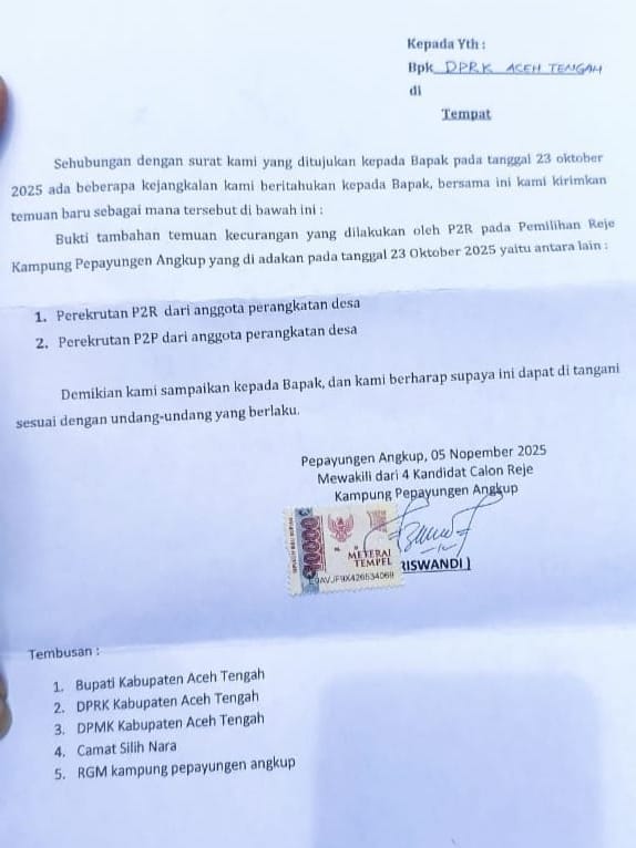 Gayonews.co.id|Takengon- Mewakili 5 Calon Reje, Riswandi layangkan surat tambahan kecurangan pada pemilihan Reje Kampung Pepayungan Angkup Kecamatan Silihnara Kabupaten Aceh Tengah.